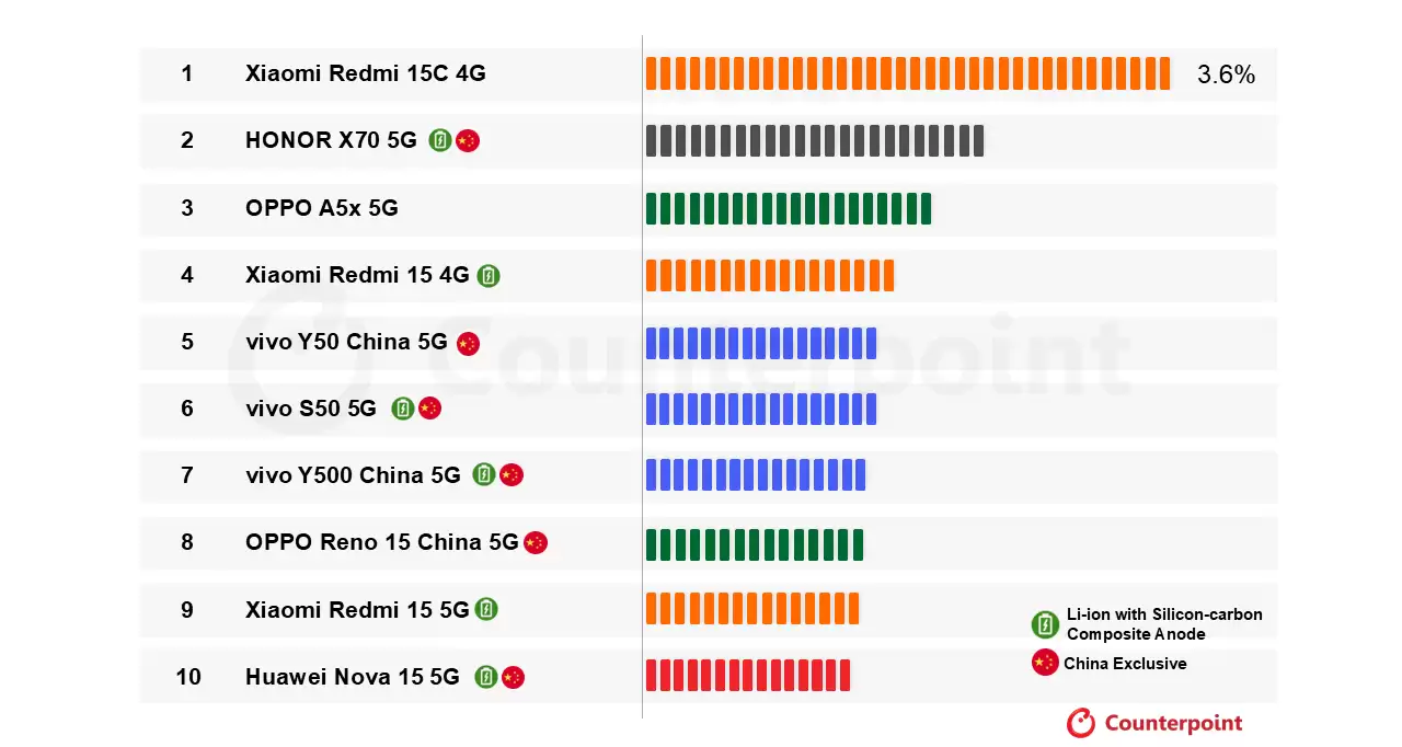 仔细看这份榜单,你会发现中国手机厂商在该领域展现出了压倒性的统治力。vivo、小米、OPPO和荣耀这四个名字,包揽了前十的所有席位。其中,小米旗下的REDMI 15C 4G依靠其极致的性价比和广泛的全球供应网络,以3.6%的市场份额登顶榜首。