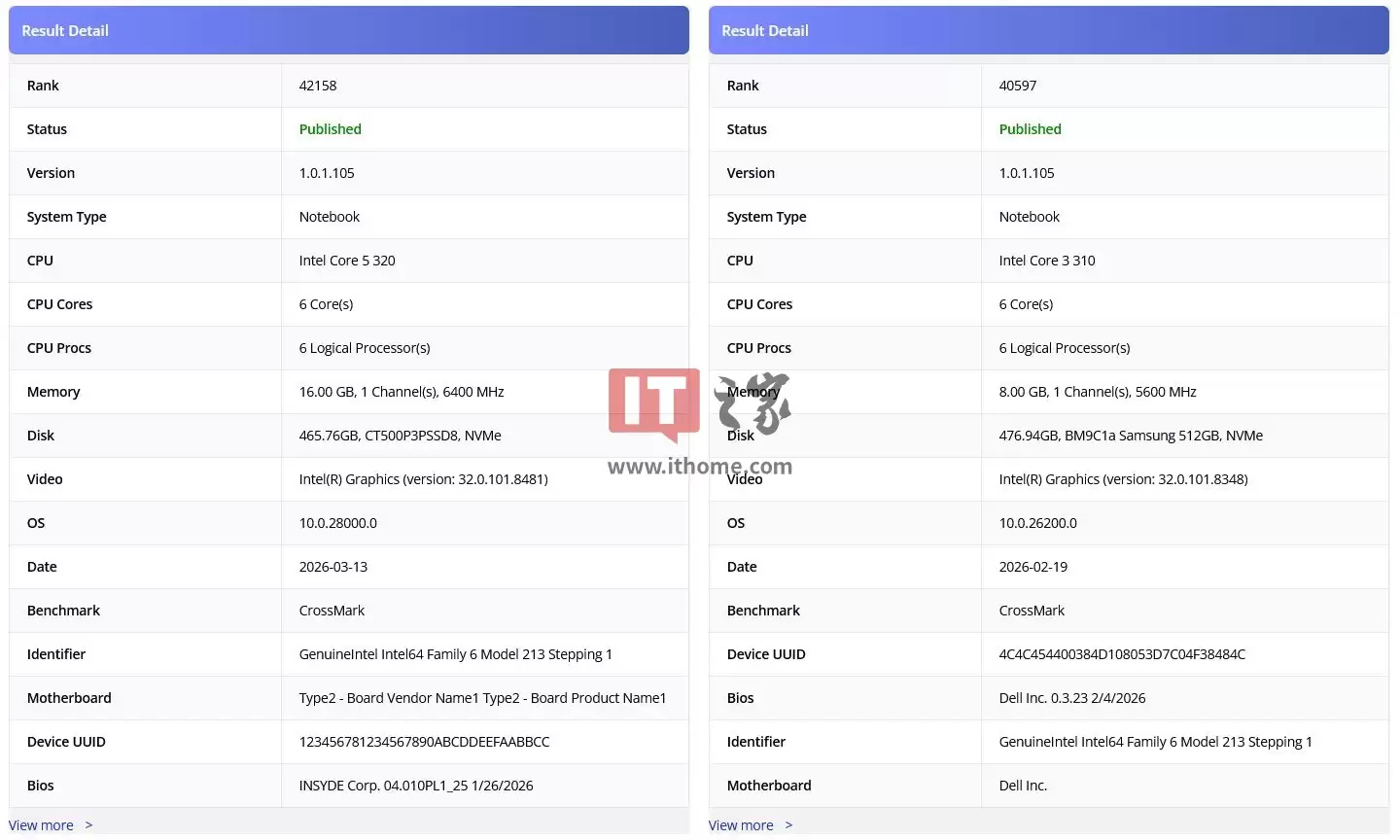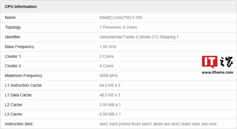 均为 6 核心 6 线程,英特尔酷睿 5 320 / 酷睿 3 310 处理器现身基准测试