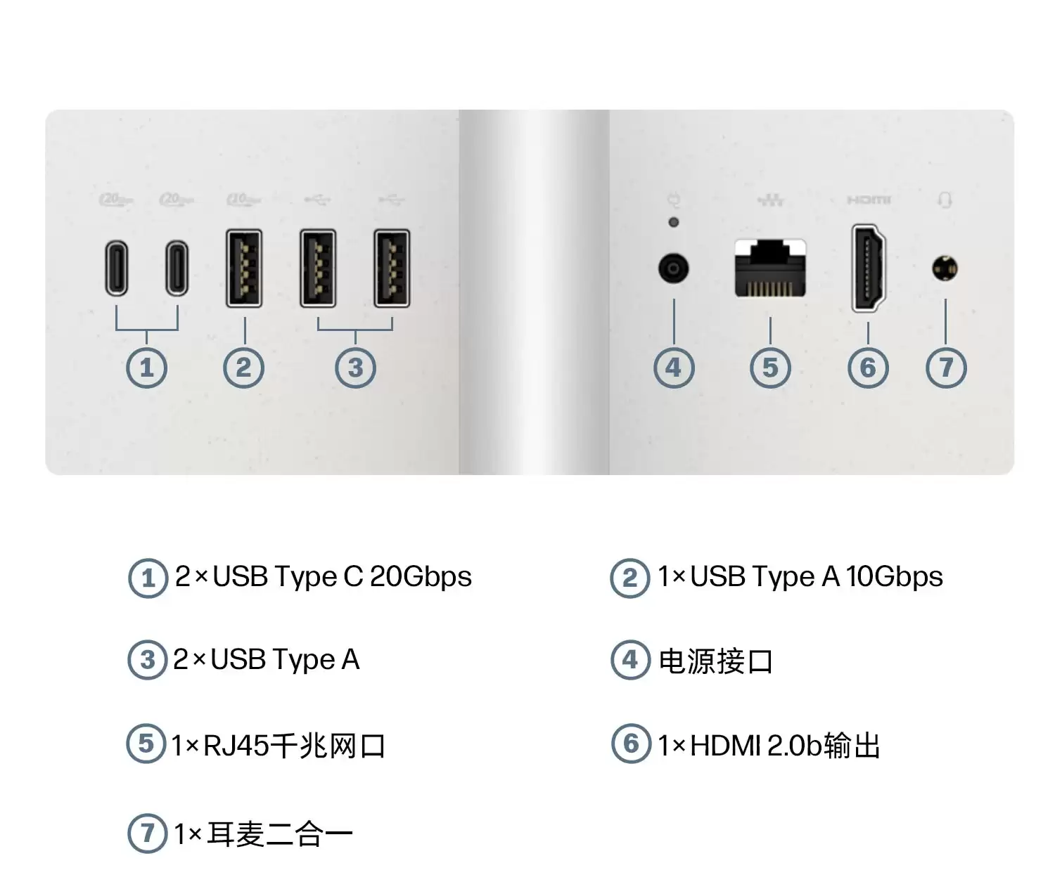 接口扩展性方面,这款一体机考虑得还算周全。它配备了两个传输速率高达20Gbps的全功能Type-C接口、一个USB Type-A(10Gbps)和两个标准USB Type-A接口。此外,千兆以太网口、HDMI 2.0b视频输出以及3.5mm音频接口也都一应俱全。无线连接则支持WiFi 6和蓝牙5.4,属于当前的主流标准。