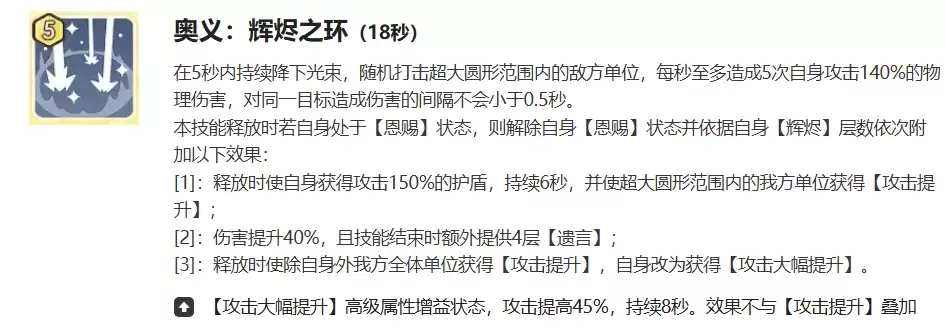 但这个技能真正的威力,在于与“恩赐状态”的联动。如果在释放奥义时布伦希尔德正处于恩赐状态,则会消耗该状态,并根据当前“辉烬”的层数触发额外特效:1层辉烬时,她能获得攻击力150%的护盾并为队友提供攻击提升;2层辉烬时,技能伤害直接提升40%,并在结束时获得4层“遗言”;而达到3层辉烬的完全体时,效果最为霸道——除自己外的所有队友获得攻击提升,而布伦希尔德本人则获得一个持续8秒、攻击力大幅提升45%的恐怖增益。