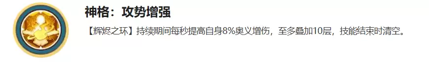 最后,她的神格“攻势增强”是一个爆发导向的被动。在“辉烬之环”持续期间,每秒能提升8%的奥义增伤,最高可叠加10层。换句话说,如果奥义持续时间足够长,最终能获得高达80%的奥义增伤,这个数值堪称恐怖。需要注意的是,该增伤效果在技能结束后会清空,因此如何把握时机,在增伤峰值期间打出最大伤害,是操作上的一个关键点。