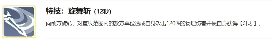 特技“旋舞斩”冷却较短,仅12秒。它会对前方直线范围造成攻击力120%的伤害,其核心作用是为自己附加“斗志”状态。这与绝技提供的“士气”完美配合,是稳定触发恩赐状态的另一块核心拼图。