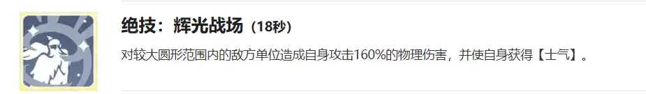 绝技“辉光战场”同样有18秒冷却,能对较大圆形范围造成攻击力160%的物理伤害,并为自己附加“士气”状态。这个技能是启动“恩赐状态”组合技的关键一环,因为获得“士气”后,只需再通过其他手段获取“斗志”,就能立刻触发恩赐。