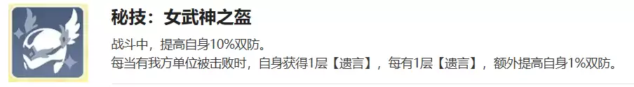 秘技“女武神之盔”是一个被动防御技能,直接提升10%的双防。其独特之处在于“遗言”机制:每当有队友被击败,布伦希尔德就会获得1层遗言,每层额外提升1%双防。这意味着在战局不利、队友减员时,她的防御能力会越战越强,堪称逆风局的坚韧壁垒。