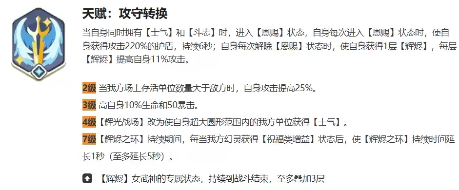 要理解布伦希尔德的强大之处,得先从她的核心机制——“攻守转换”说起。这个天赋技能的精髓在于“恩赐状态”的触发:当布伦希尔德同时拥有“士气”和“斗志”两种状态时,便会立刻进入恩赐状态。进入恩赐不仅能获得一个基于自身攻击力220%的强力护盾,持续6秒,更重要的是,在恩赐状态结束后,她会永久叠加一层“辉烬”效果。