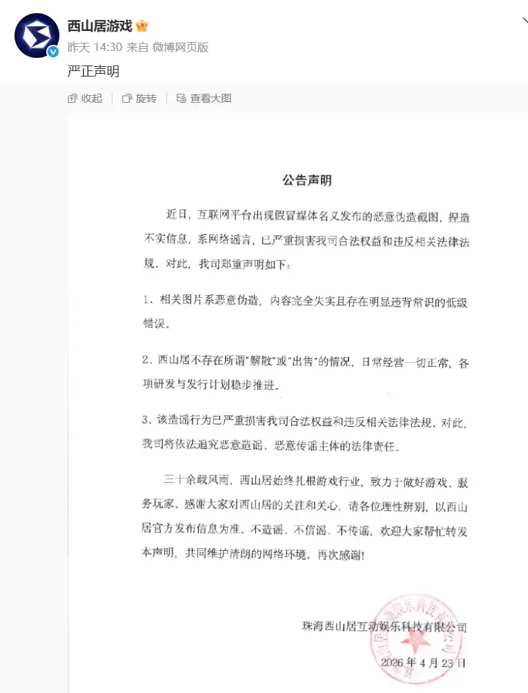 事件发酵后,西山居官方迅速发布声明进行辟谣,并表示将依法追究恶意造谣、传谣主体的法律责任。