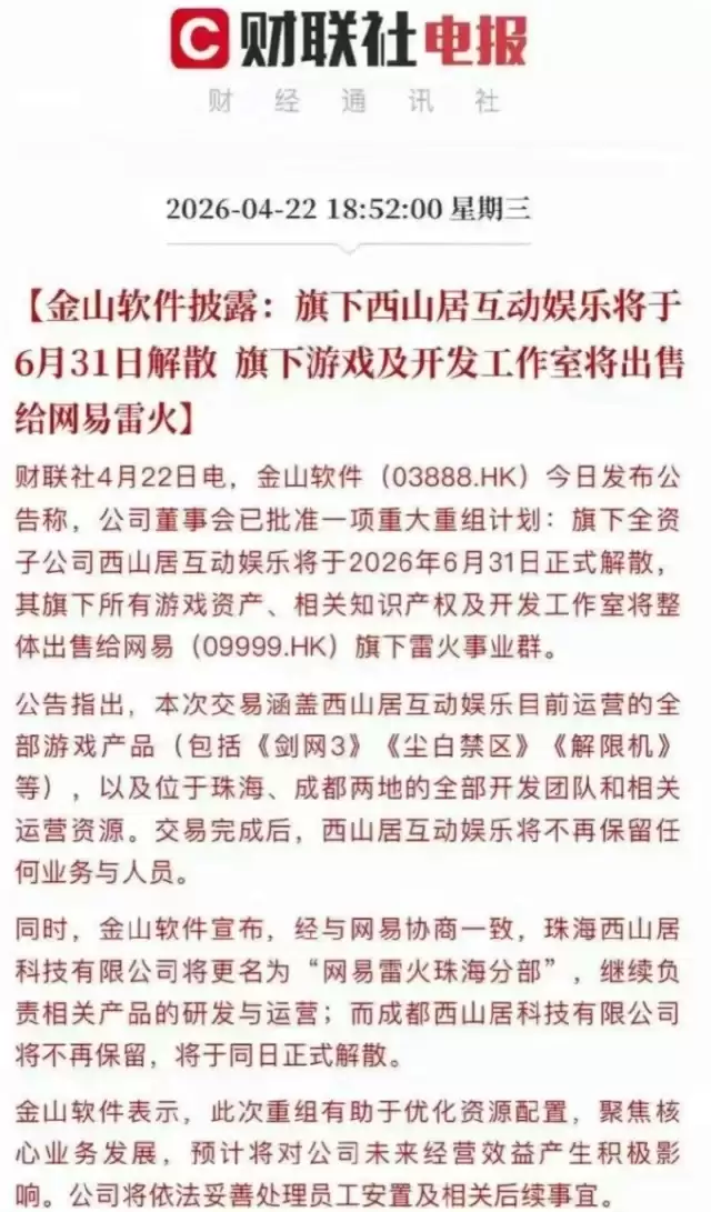 截图内容耸人听闻,称金山软件已批准重大重组,旗下西山居互动娱乐将于“2026年6月31日”解散,并将《剑网3》、《尘白禁区》、《解限机》等所有游戏资产与团队打包出售给网易雷火事业群。