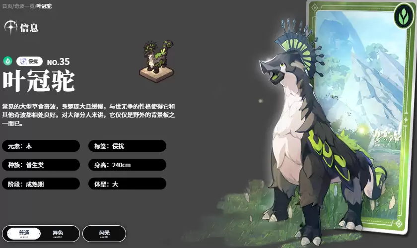 接下来看看木属性的叶冠驼。这个奇波的定位更偏向于团队守护者。技能方面,“治愈守护”、“株连灵木”、“灵木弹”和“叶冠碎击”是经典组合。它的核心功能在于“全力防守”状态,能提升自身防御力(虽然会牺牲部分攻击力),并主动嘲讽敌人长达10秒,为队友创造安全的输出环境。同时,它的治愈技能能为队友恢复5.3%的生命值,是关键时刻的续航保障。在进攻端,叶冠驼能向扇形范围连续发射12发灵木弹,造成高额木属性伤害。命中目标后,还能为我方全体提供可观的受伤减免效果,且持续时间很长。有它在场,整个队伍的生存能力会得到质的提升。