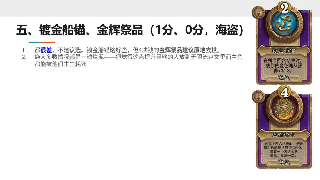 后期: 到了决赛圈,阵容通常已经固化,出售金色随从的机会微乎其微。此时它基本就是一个摆设。所以,它是一件典型的中期节奏型饰品。