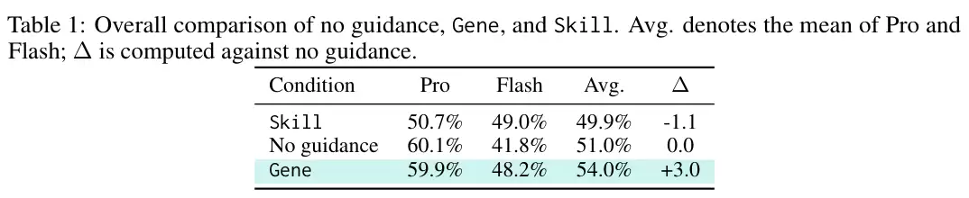 效果立竿见影。如上表所示,仅用230个Token的“基因组”,就将双模型平均通过率推升至54.0%,实现了3.0个百分点的绝对增长。它在Pro模型上保持了59.9%的高位,同时将Gemini 3.1 Flash Lite Preview的通过率从41.8%大幅拉升至48.2%。