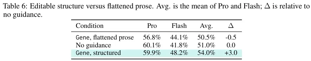 当把高度结构化的基因打散为平铺直叙的散文后,其优势几乎荡然无存,平均成绩滑落至50.5%。这证明,规范的结构化协议,是维持控制效力的关键所在。