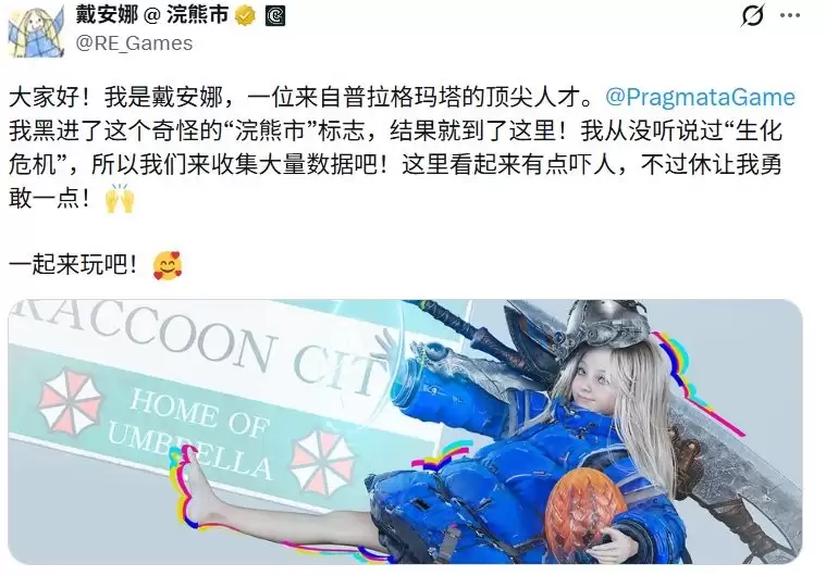 整个过程甚至像一部迷你剧,还有“前情提要”。先是身为美国特工的雪莉发现账号被来自月球的信号入侵,紧接着,戴安娜便正式接管了账号。她发布声明说:“大家好!我是戴安娜,来自 @PragmataGame 的最新款 Pragmata!我黑进了这个奇怪的‘浣熊市’标志,结果就跑到这里来啦!我从没听说过《生化危机》,所以我们多收集点数据吧!看上去有点吓人,但休告诉我要勇敢!一起开开心心地玩吧!”
