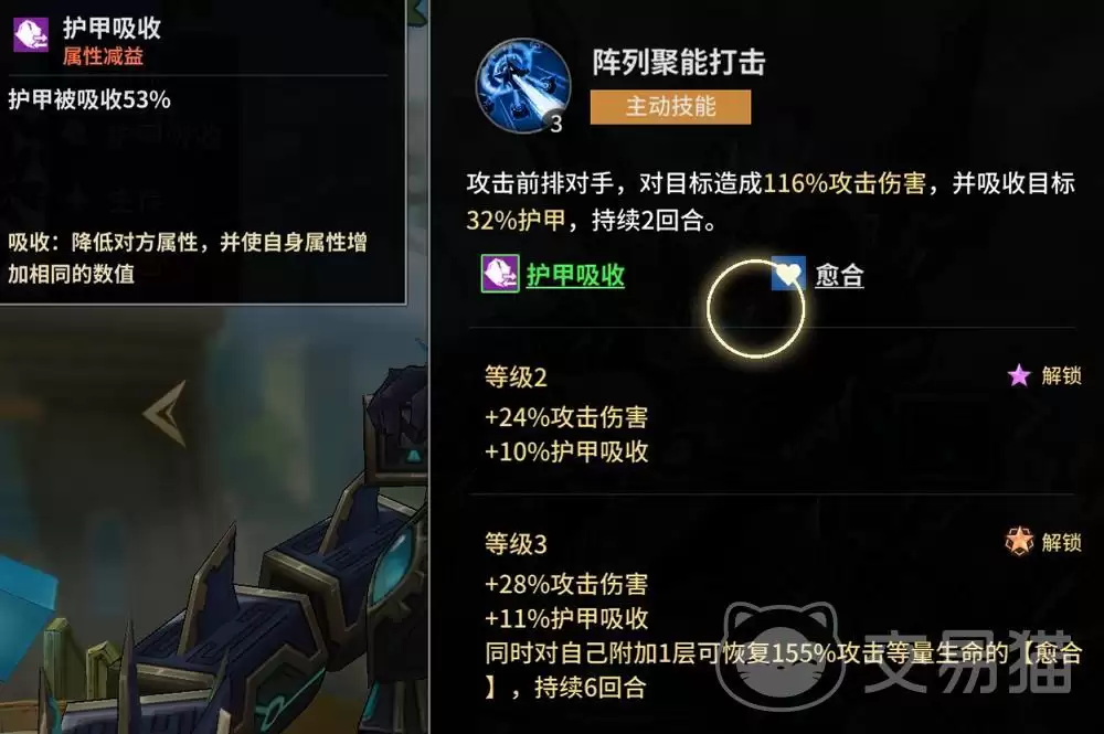 西佩托的存在,重新定义了什么叫“能打能抗”。他的主动技能在攻击敌方前排时,不仅能造成伤害,更关键的是能叠加护甲吸收效果。这可不是简单的减伤,而是同步削弱对手属性并强化自身基础属性,同时还能给自己挂上一个持续6回合的自动回血状态。而他的被动能力,则覆盖了生存的方方面面:常规的生命恢复和免伤提升只是基础;受到攻击时,他能触发反击并按自身攻击力百分比回血;甚至还有概率降低攻击者的暴击率与技能倍率。可以说,西佩托完美融合了反制压制与极限承伤的双重价值,是前排最让人安心的屏障。