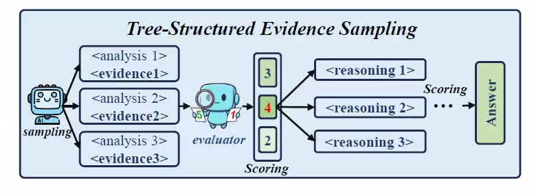 他们设计了一种“树状证据采样”方法(如下图),让模型针对同一个问题生成多条不同的证据提取路径,再分别评估每条路径的质量和最终表现,看看究竟是哪一步决定了成败。