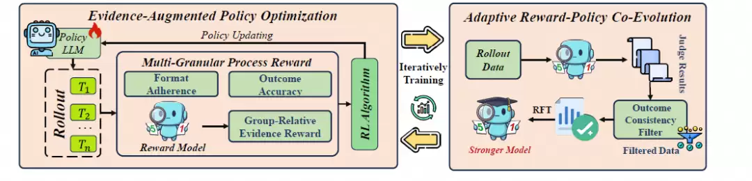 EAPO巧妙地设计了一个“自适应协同进化”机制:大模型在训练中生成的那些高置信度、且最终答案完全正确的优质证据链,会被反哺给奖励模型进行微调。
