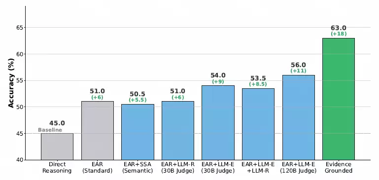数据显示,如果直接把高质量证据“喂”给模型做推理,结果准确率会从45%飙升到63%。反之,如果证据找得一塌糊涂,那么无论怎么优化后续的推理步骤,性能也几乎毫无起色。