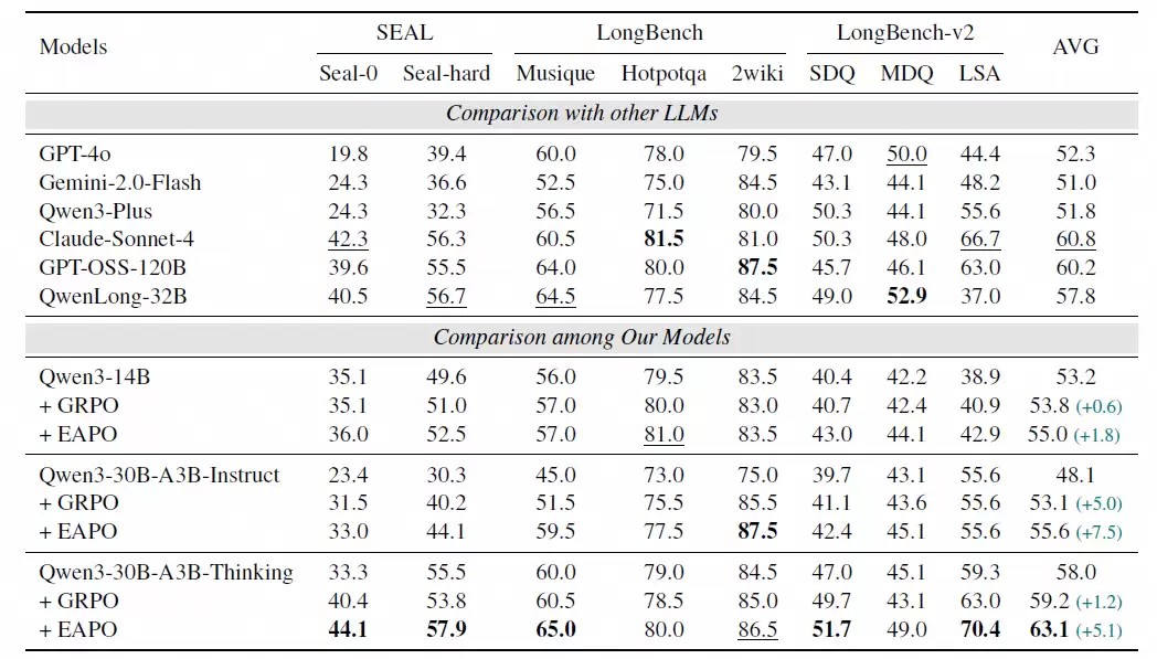 基于Qwen3-30B-Thinking训练的EAPO模型,平均得分达到63.1%,性能相较基线提升了5.1%。更值得注意的是,它击败了体量大得多的开源模型GPT-OSS-120B,甚至超越了GPT-4o、Claude-Sonnet-4等闭源大模型。