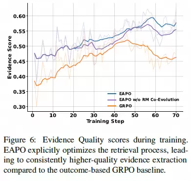 从训练过程中的“证据质量得分”来看,GRPO隐式地优化证据,提升非常缓慢;而EAPO直接针对证据质量打分,其寻找证据的能力始终保持着断崖式的领先优势。