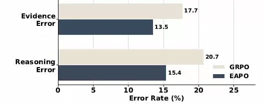 EAPO实现了两类错误的双降。有意思的是,它并没有显式地监督推理步骤,但推理错误率几乎下降了同样的幅度。这恰恰说明,推理本身或许没那么难,它只是经常被错误的证据带偏了方向。一旦前提是对的,结论自然就容易对了。