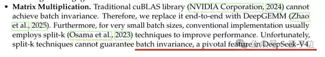 在矩阵乘法中,split-K的做法是沿着归约维度K进行切分并行计算。多路并行求和后还需再次归约,而浮点数加法的归约顺序一旦改变,最终结果的低位比特就可能不同,这与批次不变性的要求存在根本冲突。
