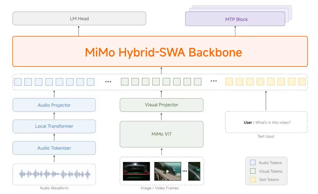 再来看看标准版的MiMo-V2.5。这是一个3100亿参数的稀疏MoE模型,激活参数为150亿,在48万亿Token上进行了训练。它的语言主干同样继承了混合滑动窗口注意力机制,并搭载了自研的预训练视觉和音频编码器,这两类编码器通过轻量化的投影模块实现了跨模态融合。