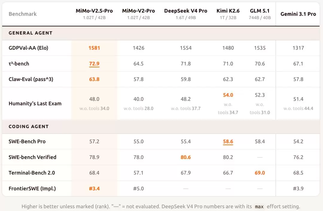 而今天,随着模型权重全面开放,MiMo-V2.5-Pro的完整基准测试成绩也一并揭晓。根据小米公布的数据,该模型在GDPVal-AA(Elo)、Claw-Eval(pass^3)等多个关键评测中,表现已经超过了最新开源的DeepSeek-V4-Pro,甚至压过了发布不久的Kimi K2.6等主流闭源模型,实现了总体最佳。