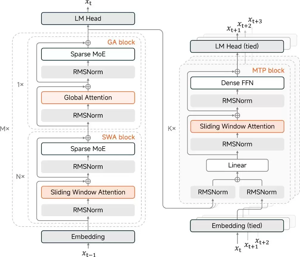 具体来看,它继承了MiMo-V2-Flash的混合注意力机制和多标记预测设计。局部滑动窗口注意力和全局注意力以6:1的比例交错使用,窗口大小为128个Token。这种设计在长上下文场景下效果显著,通过可学习的注意力池偏置,能将键值缓存的存储空间压缩近7倍,同时性能不打折扣。而那个轻量级的多标记预测模块,采用密集前馈网络,原生集成在训练和推理流程中,使得输出吞吐量提升了大约三倍,也加速了强化学习的部署效率。