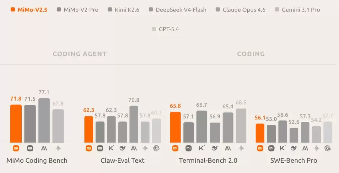 那么,实际效果如何?从公布的测评结果看,MiMo-V2.5在Claw-Eval Text、Terminal-Bench 2.0、SWE-Bench Pro等多个评测集上,成绩大幅超越了DeepSeek最新发布的DeepSeek-V4-Flash。