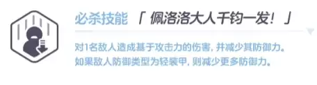 必杀技能「佩洛洛大人干钧一发!」是一个单体技能,能对一名敌人造成伤害并降低其防御力,若目标为轻装甲类型,削防效果更为显著。单看伤害数字,这个必杀或许不算出彩,但其战略意义在于为团队创造输出窗口。敌人的防御被降低了,队伍里的主力输出手们自然能打出更漂亮的伤害。可以说,这是一个典型的辅助型必杀。