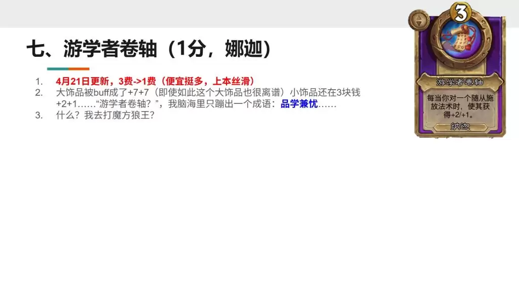到了中后期,场面随从数量固定,阵容基本成型。这时,游学者卷轴的收益会相对稳定一些,毕竟随机范围缩小了。对于走“平均养蛊”路线的阵容(比如各种杂毛混搭流),每回合稳定的全体潜力+1/+1,长期积累下来,身材膨胀不容小觑,能有效提升阵容的整体厚度。