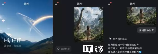 具体怎么玩?流程其实相当简单。用户只需要在手机端上传一张图片,然后选择「生成图中世界」;或者更直接一点,输入“用第一人称视角探索世界”这样的指令。接下来,等待几秒钟,一个属于你的「世界」就生成了。整个过程几乎没有任何门槛,主打的就是一个随时随地。