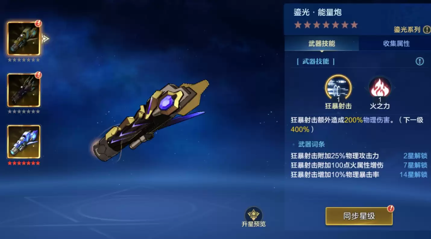 再看三把进阶专武,它们的分工更加明确,各自针对不同的技能提供加成。如何判断哪个技能受到了专武影响?很简单:受加成的技能名称前会带有特殊的专属前缀,同时在技能界面里,你会看到清晰的专武标识。这样一来,哪些技能能吃到专武红利就一目了然了。至于进阶专武的强化,主要通过“升星”来实现。升星所需的材料,主要来源于游戏内定期开放的各种活动。当进阶专武的星级达到特定阶段时,还能解锁额外的“星级能力”,为对应技能带来更深层次的强化。星级越高,该技能在实战中的威力也就越惊人。