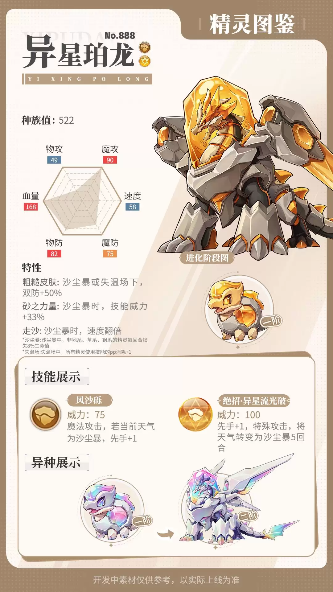 接下来,我们重点拆解一下异星珀龙的技能组。它的技能以地系为主,辅以一个光系技能,核心战术围绕“沙尘暴”天气展开,攻防一体,非常有意思。