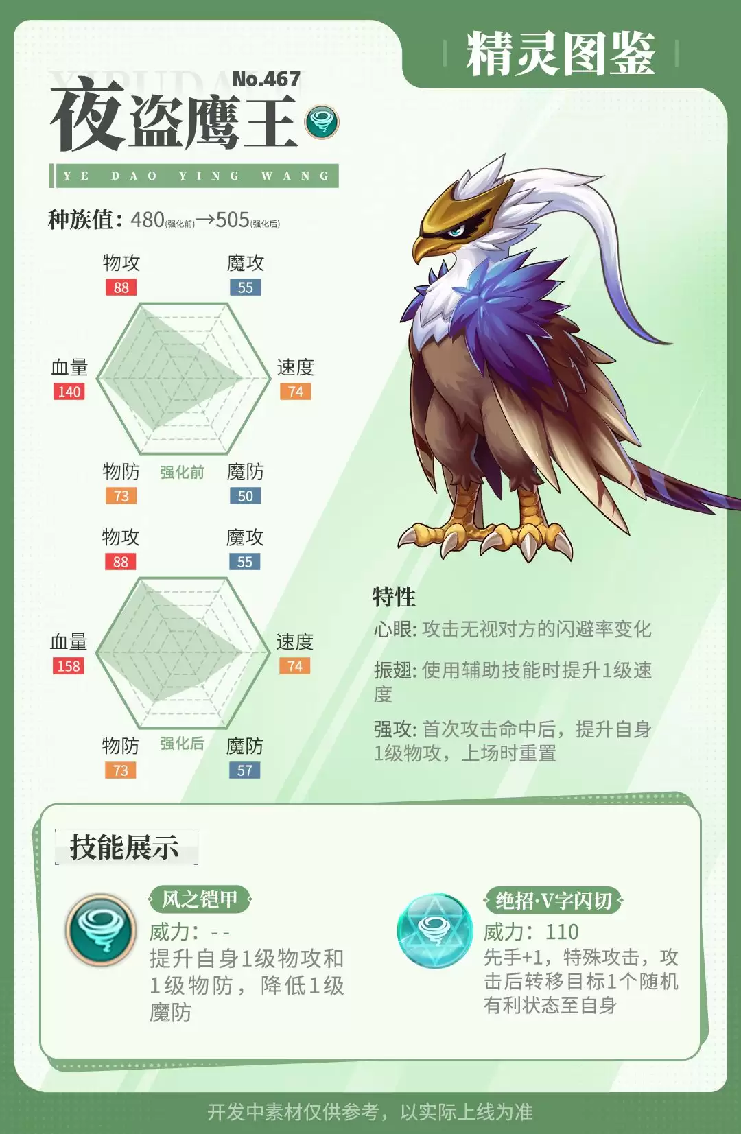 今天,咱们来详细拆解一下这位来自“天际云海”的新晋强者——夜盗鹰王·强化。它的技能组设计得相当有特色,既有爆发,也有战术干扰,实战中能玩出不少花样。