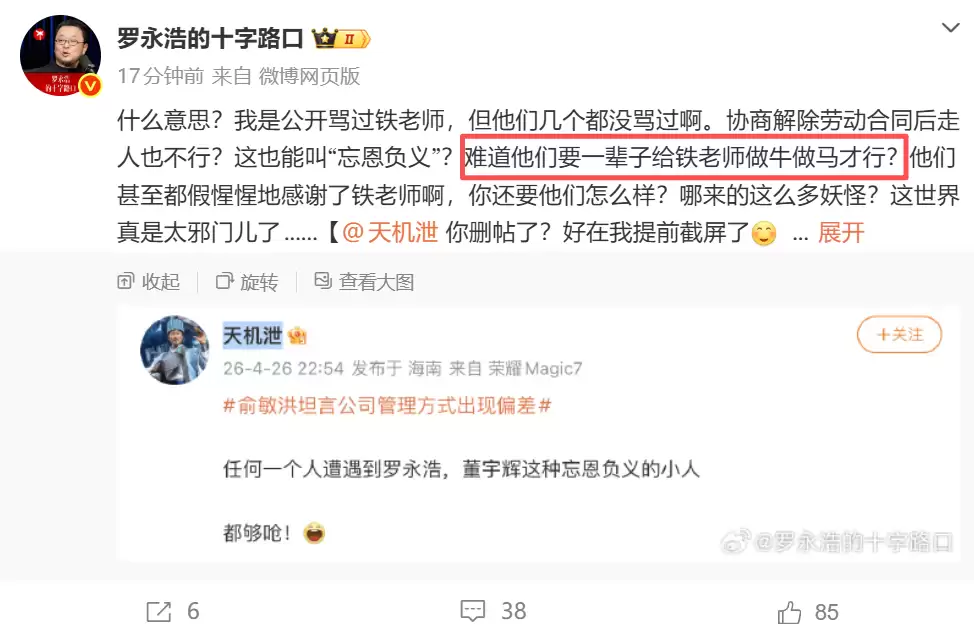 4月27日下午,他在社交平台上写道:“什么意思?我是公开骂过铁老师,但他们几个都没骂过啊。协商解除劳动合同后走人也不行?这也能叫‘忘恩负义’?难道他们要一辈子给铁老师做牛做马才行?他们甚至都假惺惺地感谢了铁老师啊,你还要他们怎么样?哪来的这么多妖怪?这世界真是太邪门儿了......”