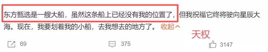 天权的表述则更为委婉,但指向同样明确。他说:“过去的四个月里,公司的执行管理层变了,有些理念变了,直播间的风格变了,办公氛围也变了。”最后,他用一个充满遗憾的比喻作结:“东方甄选是一艘大船,可惜船上已经没有我的位置了。”