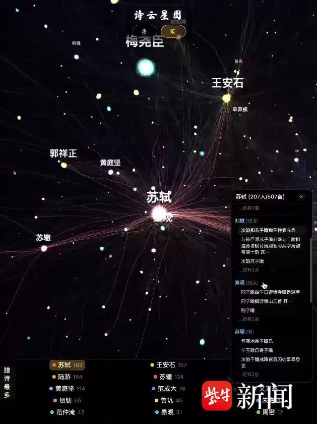 沿着这个方向,瑞贤持续发力。今年1月25日,他借助AI辅助推出了《苏轼的朋友圈对你可见》。这个作品将以苏轼为中心的诗词唱和关系网络进行了可视化呈现:中心是苏轼,与他诗词往来越频繁、关系越密切的人,在璀璨的星图中就离他越近。用户可以缩放、旋转星图,点击任何一个人名,都能看到其生平简介和代表诗作。