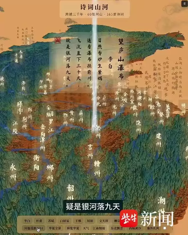 近期,他推出了耗时两个月的作品《跟着诗词去旅行》,将165首古代诗词与对应的山河胜景精准关联。“点击悬浮于山河之上的诗词,你就能看到李白醉卧庐山,吟诵‘飞流直下三千尺,疑是银河落九天’;崔颢登临黄鹤楼,感叹‘黄鹤一去不复返,白云千载空悠悠’;苏轼在密州郊外纵马,‘老夫聊发少年狂,左牵黄,右擎苍’的豪情跃然眼前。”
