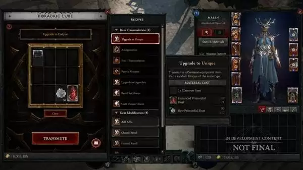 - 升级为传奇: 用黄色装备升级,保留原有词缀,并随机赋予一个传奇特效。