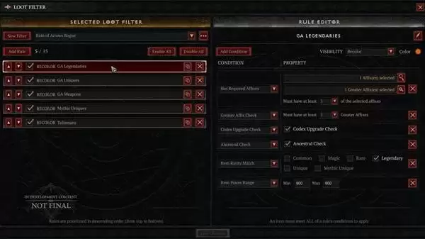 千呼万唤始出来的功能。玩家现在可以自定义过滤器,隐藏掉那些不需要的物品。你可以根据词缀、物品品质等条件来设定显示规则,甚至能用不同颜色高亮标记特定物品。更便利的是,过滤器可以生成代码,方便玩家之间分享和导入成熟的过滤方案,极大优化了后期刷图的体验。