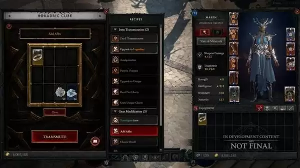 除了最后一项,其他功能都可以通过消耗新型材料“调谐棱柱”(分攻击、防御等不同类型)来实现定向操作。因此,游戏后期将围绕收集各种棱柱来定向打造“准毕业”装备,而真正的“毕业”装备,则需要天生3或4条顶级词缀(太古)的底子,再通过方块最终完善。