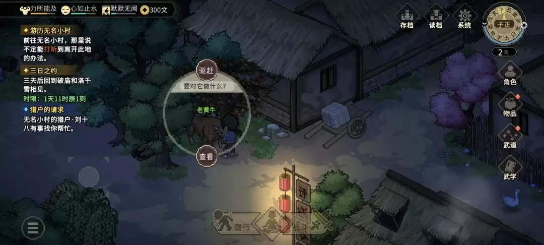 拿到线索后,直奔无名客栈左边,那里站着一头[老黄牛]。点击它,会出现选项。这里有个重要抉择:务必选择“驱赶”,千万别选“杀它”。把牛赶走之后,它原先站的位置就会刷出一把[蒲扇※武器/扇子],捡起来就行。