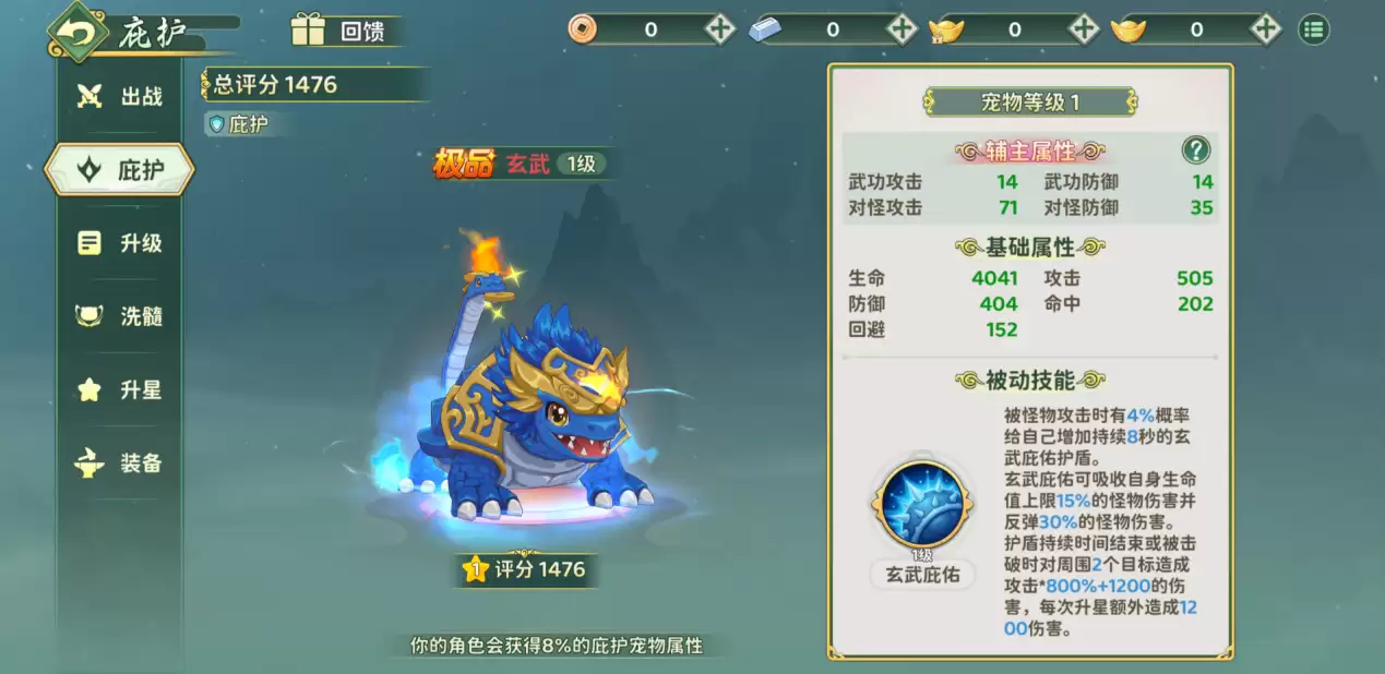 核心技能“玄武庇佑”的机制,值得好好说道。效果是这样的:当你被怪物攻击时,有4%的概率为自己套上一个持续8秒的“玄武庇佑”护盾。这个护盾能吸收相当于你自身生命值上限15%的怪物伤害,更妙的是,它还能反弹30%的所受伤害给怪物。攻防一体,对吧?但这还没完。当护盾因为时间到了或者被击破时,还会对周围最多2个目标造成一次爆发伤害,数值为攻击力的800%加上1200点固定伤害。而且请注意,宠物每次升星,这个爆发伤害还会额外增加1200点。这意味着,玄武不仅是面盾牌,更是一个潜力巨大的伤害源。