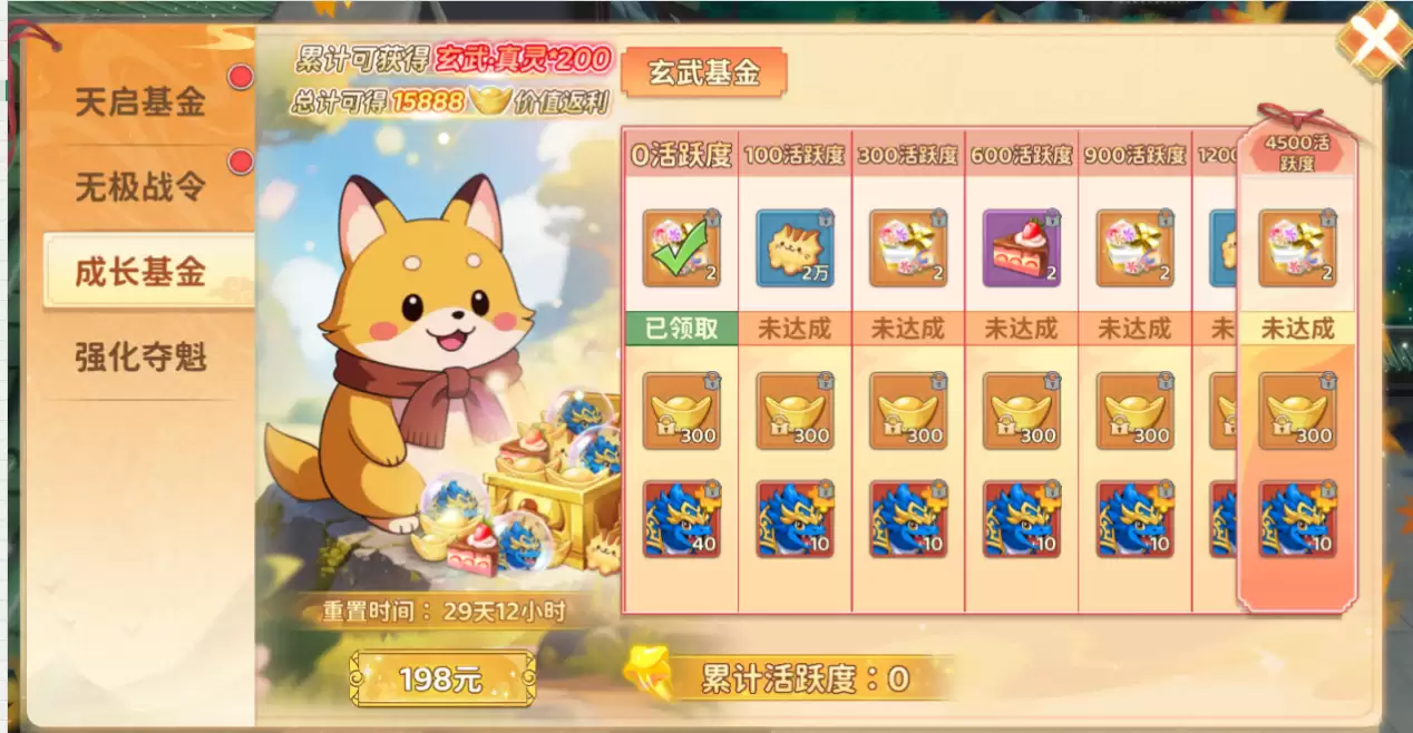 获取和培养方面,配套的“玄武基金”活动安排得很清晰。通过完成日常任务积累活跃度,就能稳步推进奖励。一旦激活基金,直接就能领取200个“玄武·真灵”,这为神宠的快速升星起步提供了关键资源,能让你在培养路上快人一步。