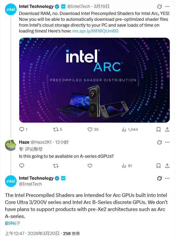 就在今天,英特尔给出了一个明确的官方确认:前几天随着 32.0.101.8626 版显卡驱动推出的那项图形着色器分发服务,它的“未来”计划里,并不包含旧型号的显卡。
