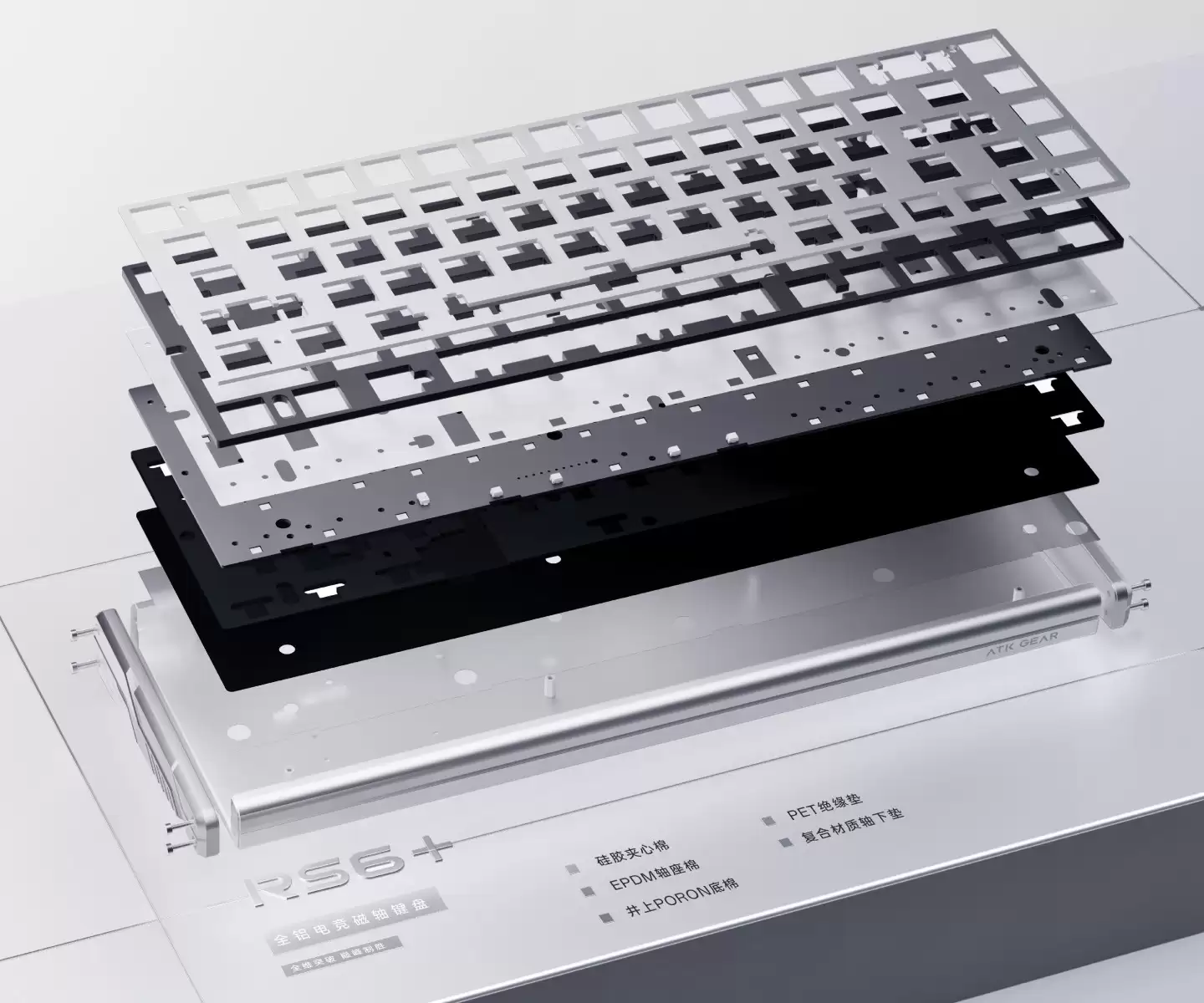 全铝外壳之下,RS6+的内部架构同样为高性能服务。其核心是一颗480MHz的MCU主控,并搭载了1.2mm厚度的PCB板以确保信号稳定性。在影响手感与声学的内部填充方面,ATK采用了五层消音结构,其中包含定制的复合材料轴下垫。这套方案旨在确保极速响应的同时,优化按键触底声音与敲击一致性。