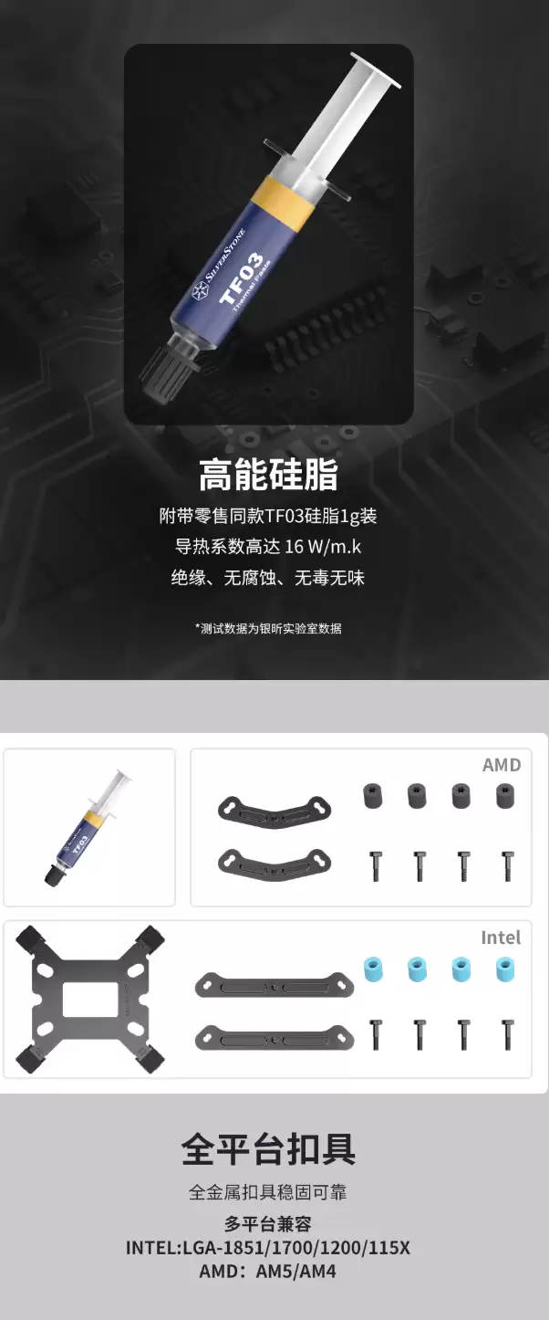 散热器搭载均衡连叶扇,该设计通过优化扇叶末端气流,有效抑制涡流产生,在提升风量效率的同时降低运行风噪。风扇转速区间为800-2300 RPM,对应噪音控制在8.8-29.3 dBA,静音表现突出。其MTTF寿命超过4万小时,确保了长期运行的可靠性。包装内附赠1g装TF03高性能硅脂,其16W/m.k的导热系数为用户省去了额外采购的步骤。