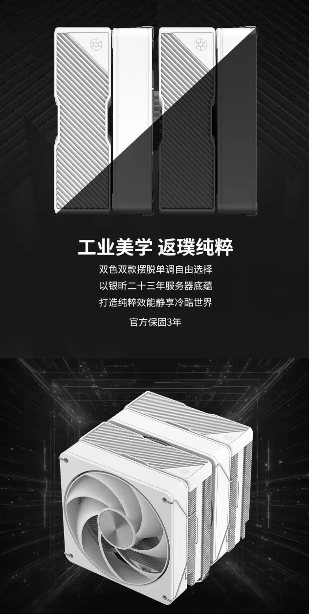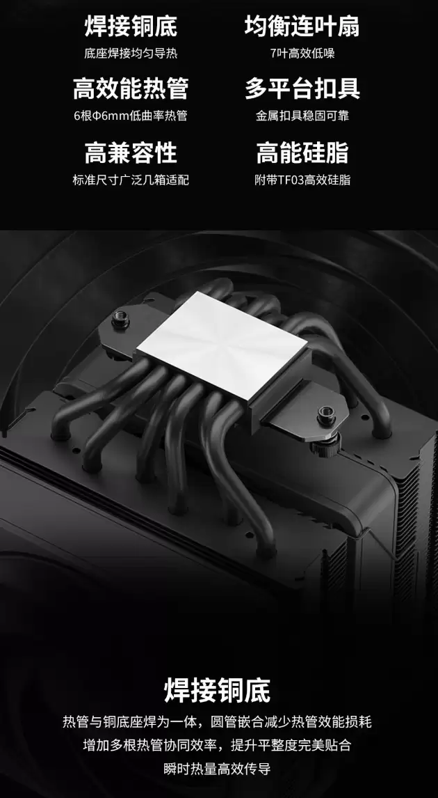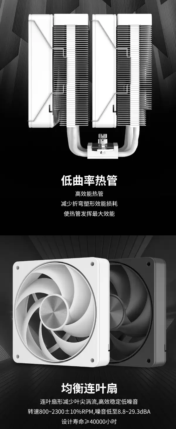 外观提供经典黑、白双色,适配不同装机主题。其底座采用焊接铜底工艺,这一设计显著降低了热管与底座间的界面热阻,并确保接触面平整,从而实现从CPU顶盖到热管阵列更高效、均匀的热量传导。结合低曲率热管,整套散热方案旨在达成高效散热与低噪音运行的平衡。