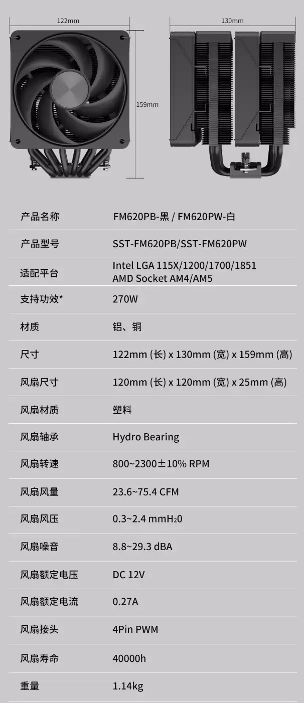 散热器尺寸为122mm x 130mm x 159mm,为标准双塔结构,选购时需注意机箱兼容性与内存避让空间。平台兼容性覆盖广泛:支持英特尔LGA 115X/1200/1700/1851接口及AMD AM4/AM5平台。其标称270W TDP解热能力,足以驾驭高端处理器默频及超频负载。双风扇配置确保气流充分穿透双塔鳍片群,保障CPU性能持续稳定释放。