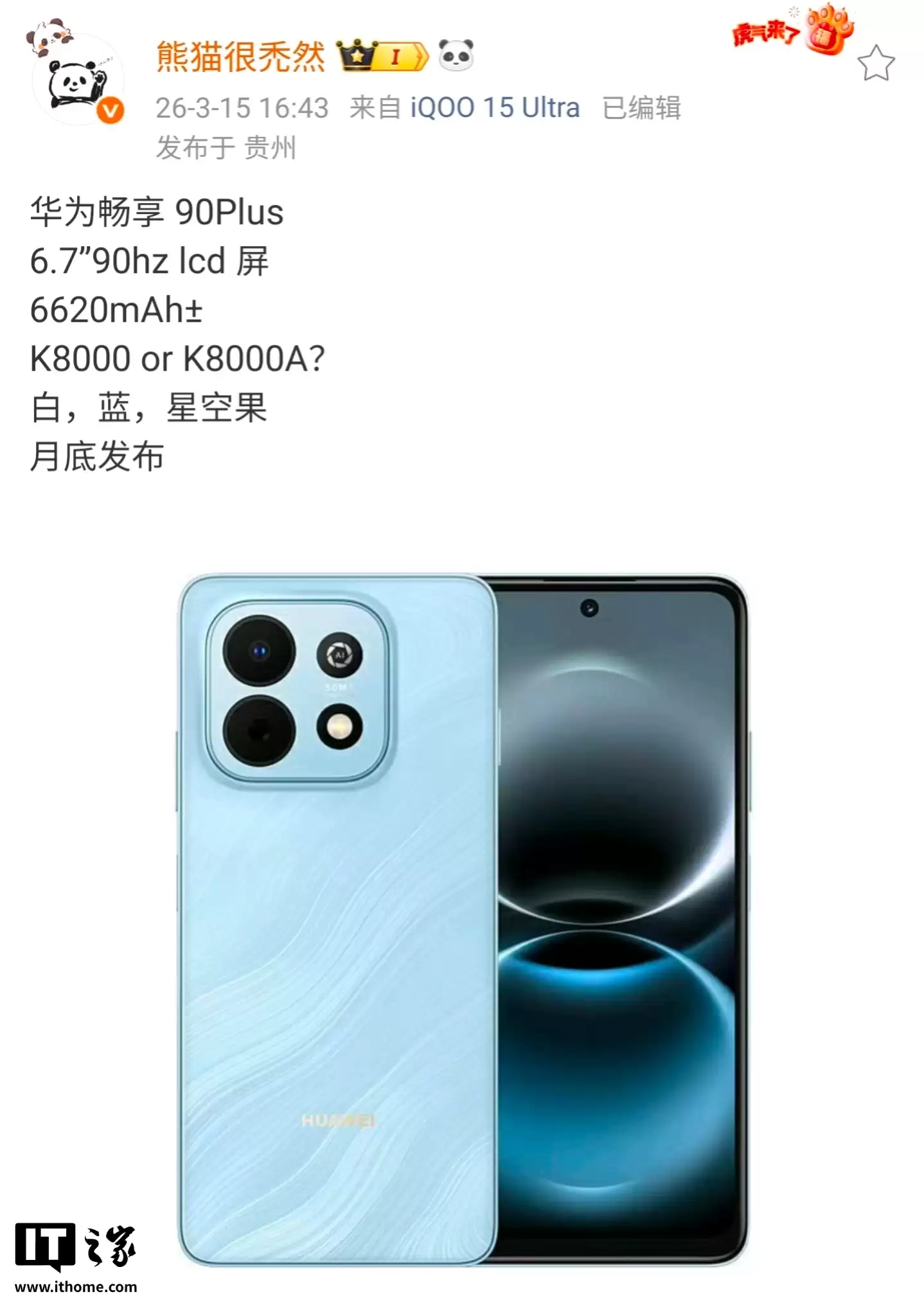 消息称华为畅享 90 Plus 手机配备 6.7 英寸 LCD 屏 + 6620mAh 电池